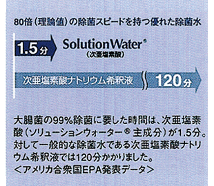 | ソリューションウォーターは次亜鉛素酸ナトリウム希釈液の80倍の除菌スピード(理論値)と同等の抗菌性を持ちながら、人体に安全な除菌・消臭水です。 |